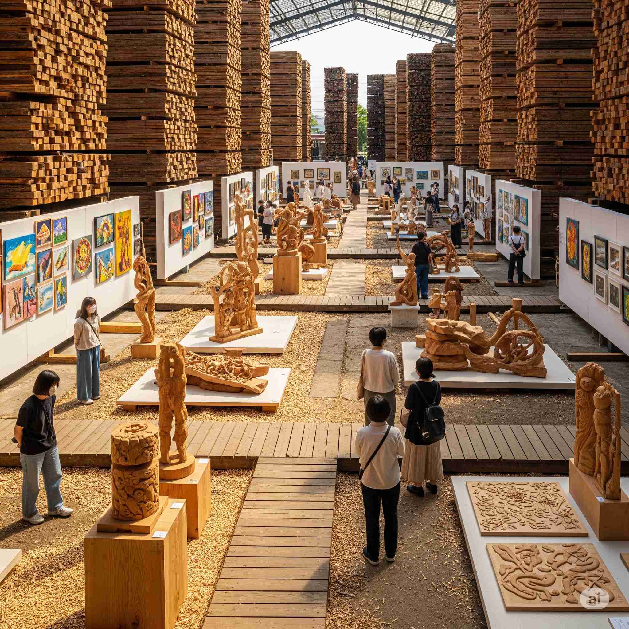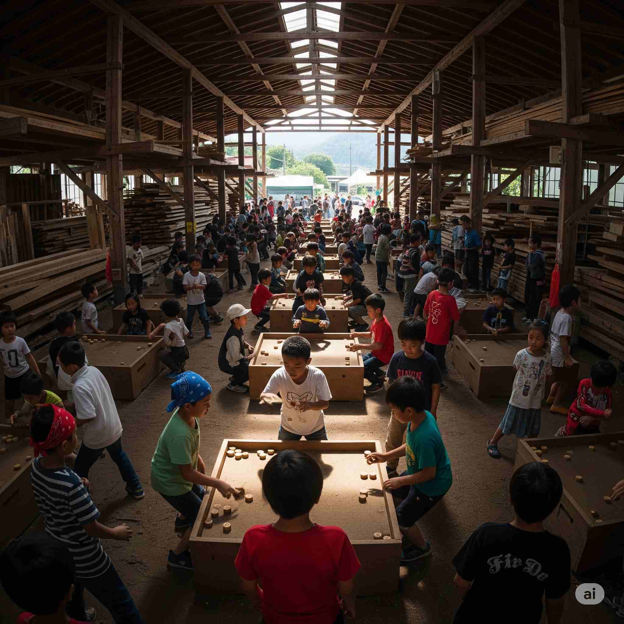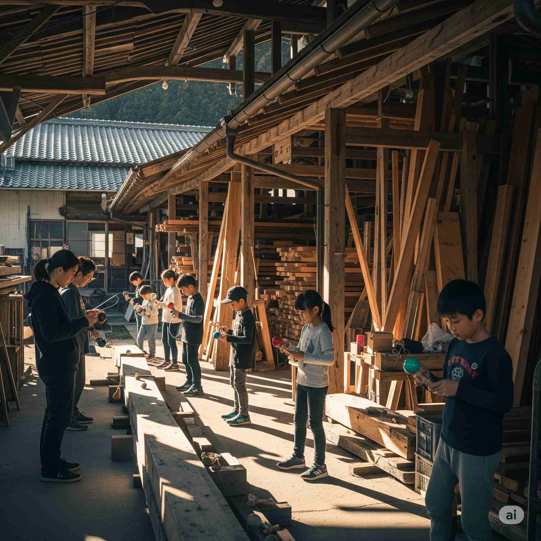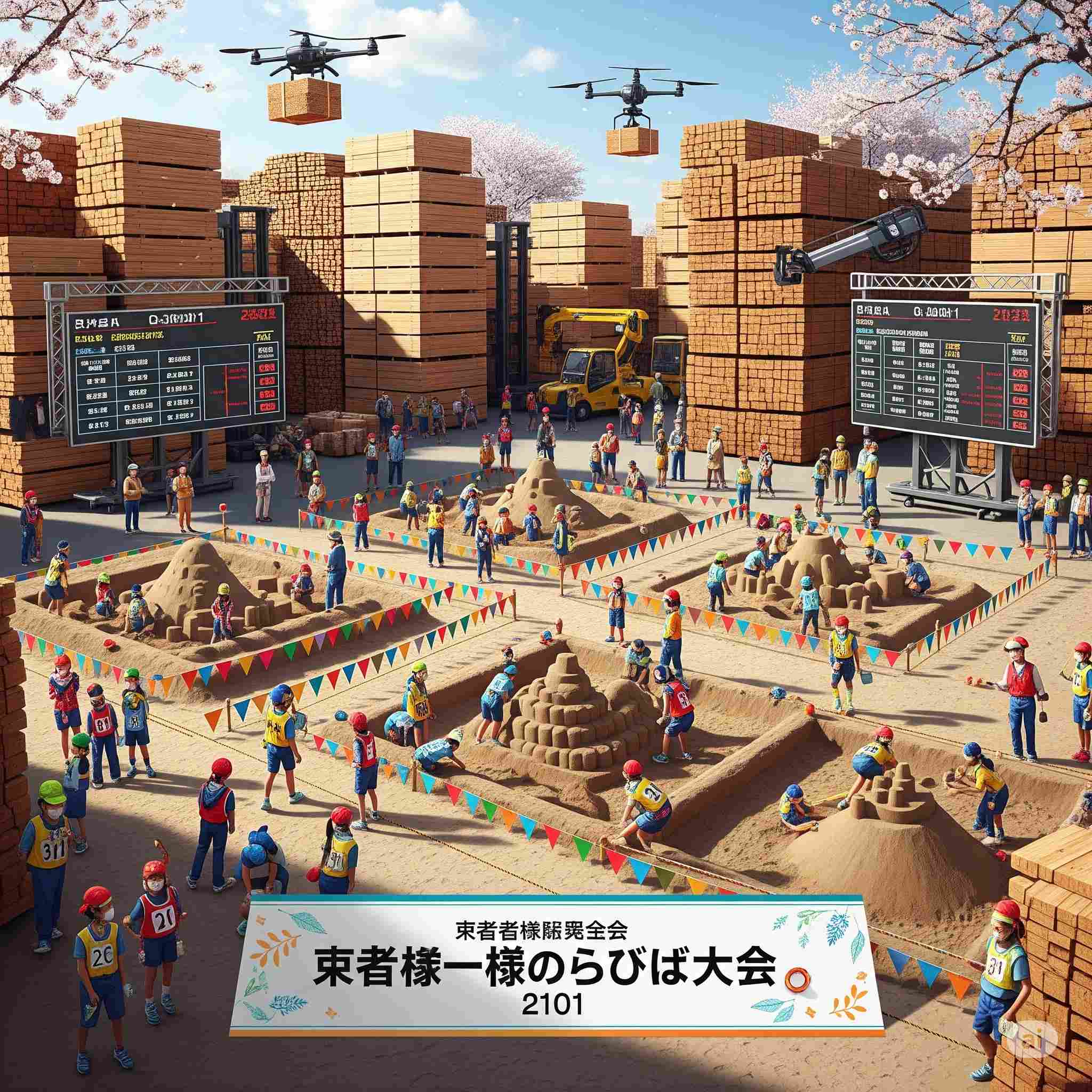 【お題】夏休み、広大な木材市場で開催されるインバウンド向けの昭和レトロな木製玩具のフェスティバル、予想図。