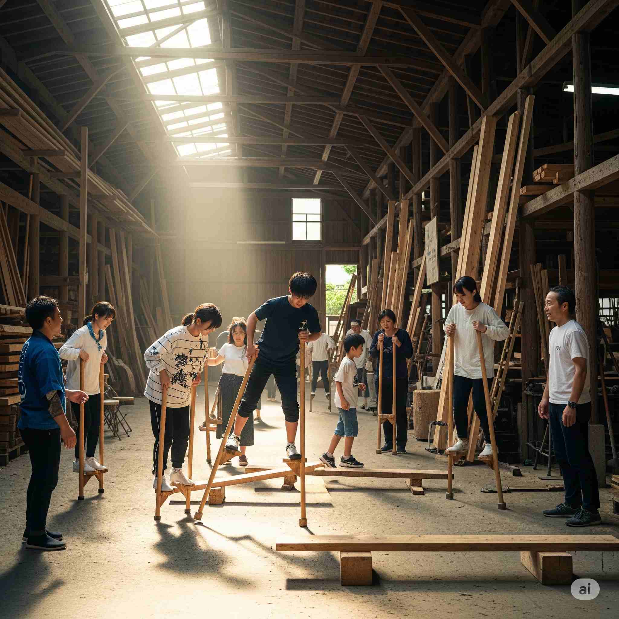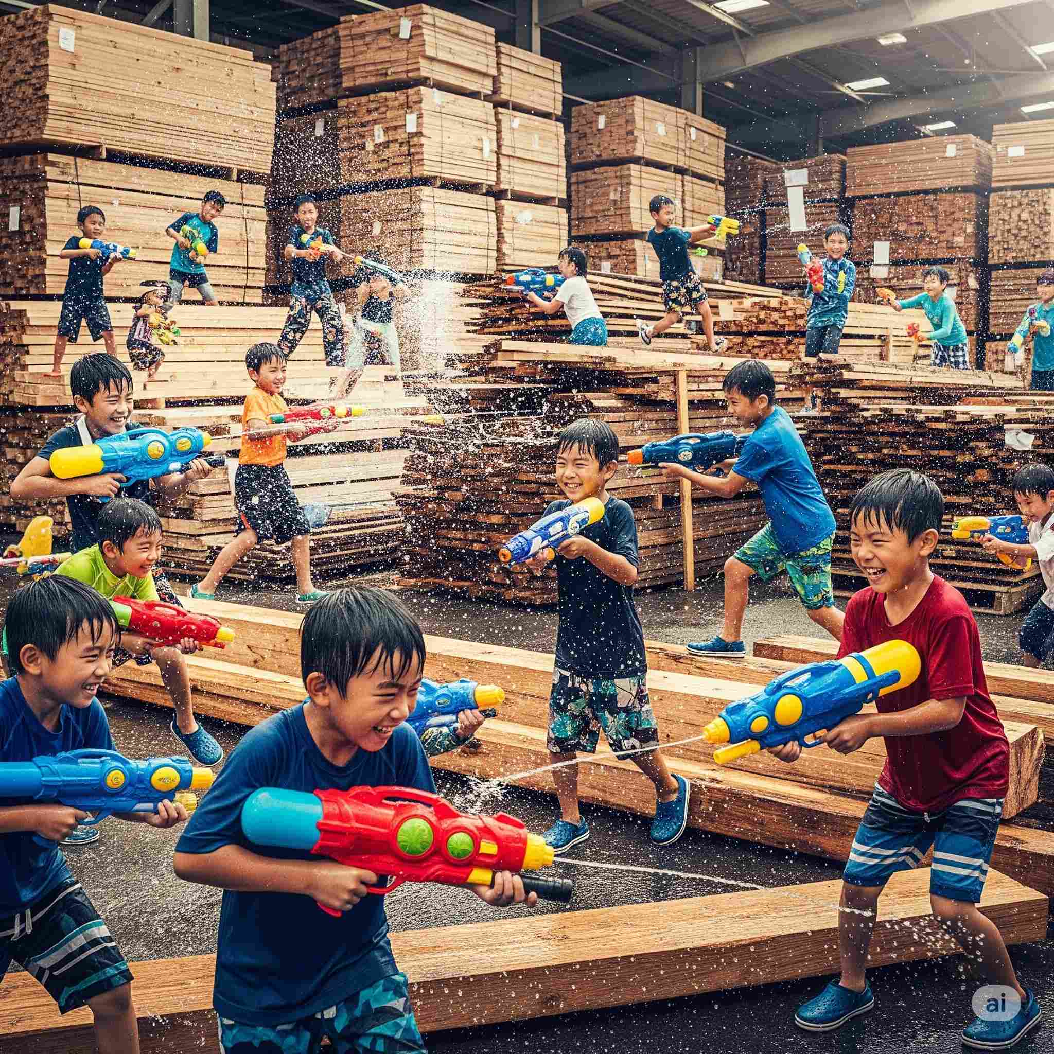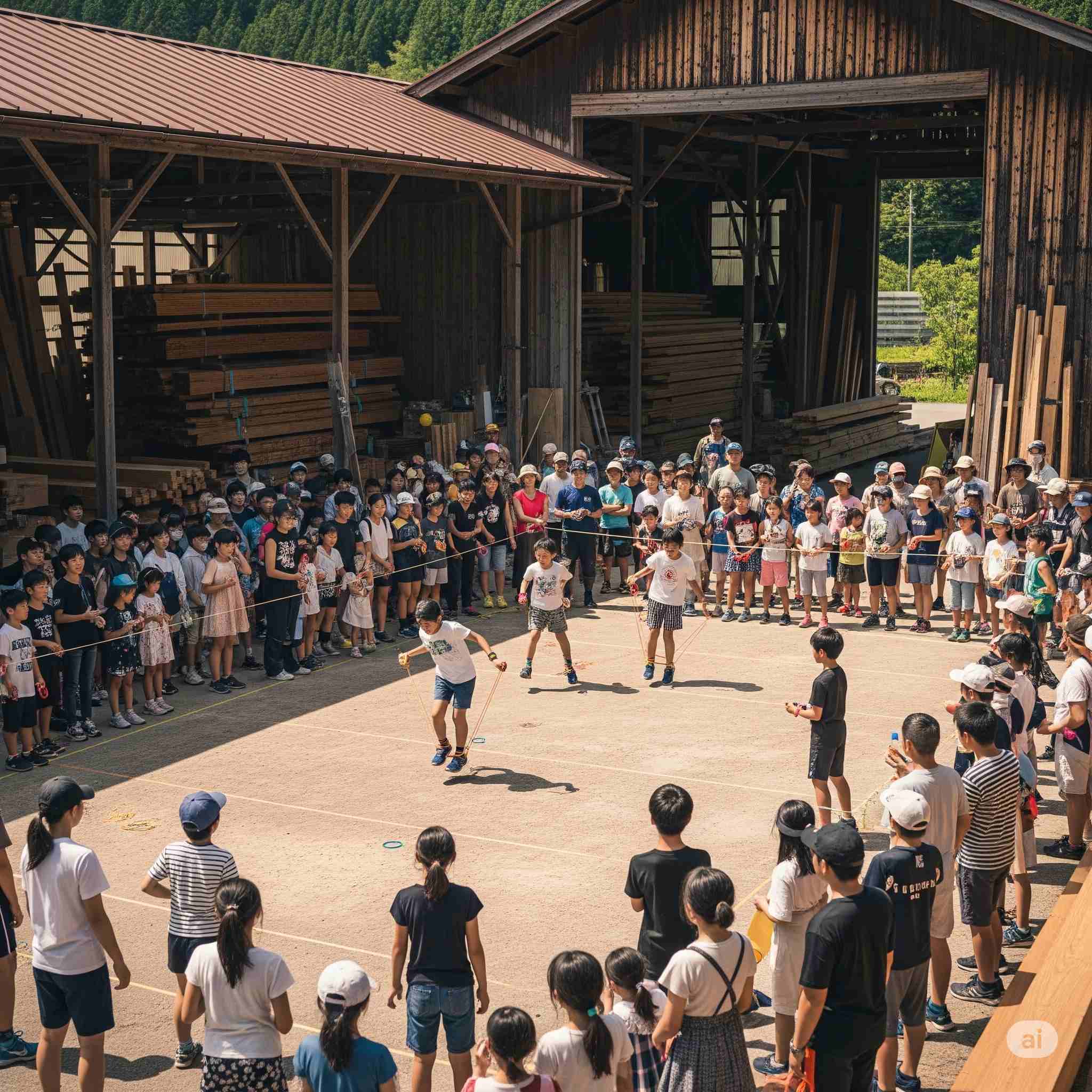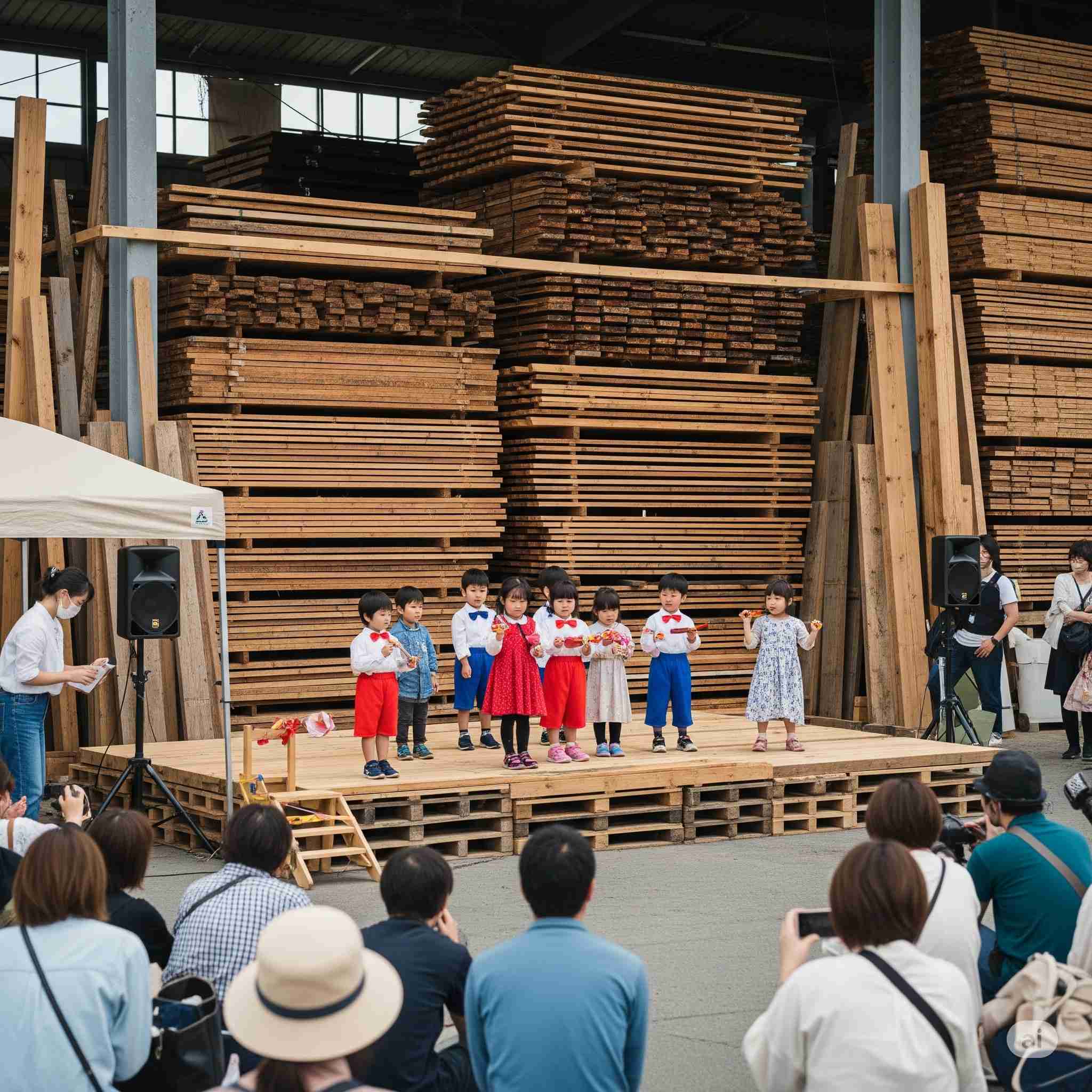 【お題】夏休み、広大な木材市場で開催されるインバウンド向けの昭和レトロな木製玩具のフェスティバル、予想図。