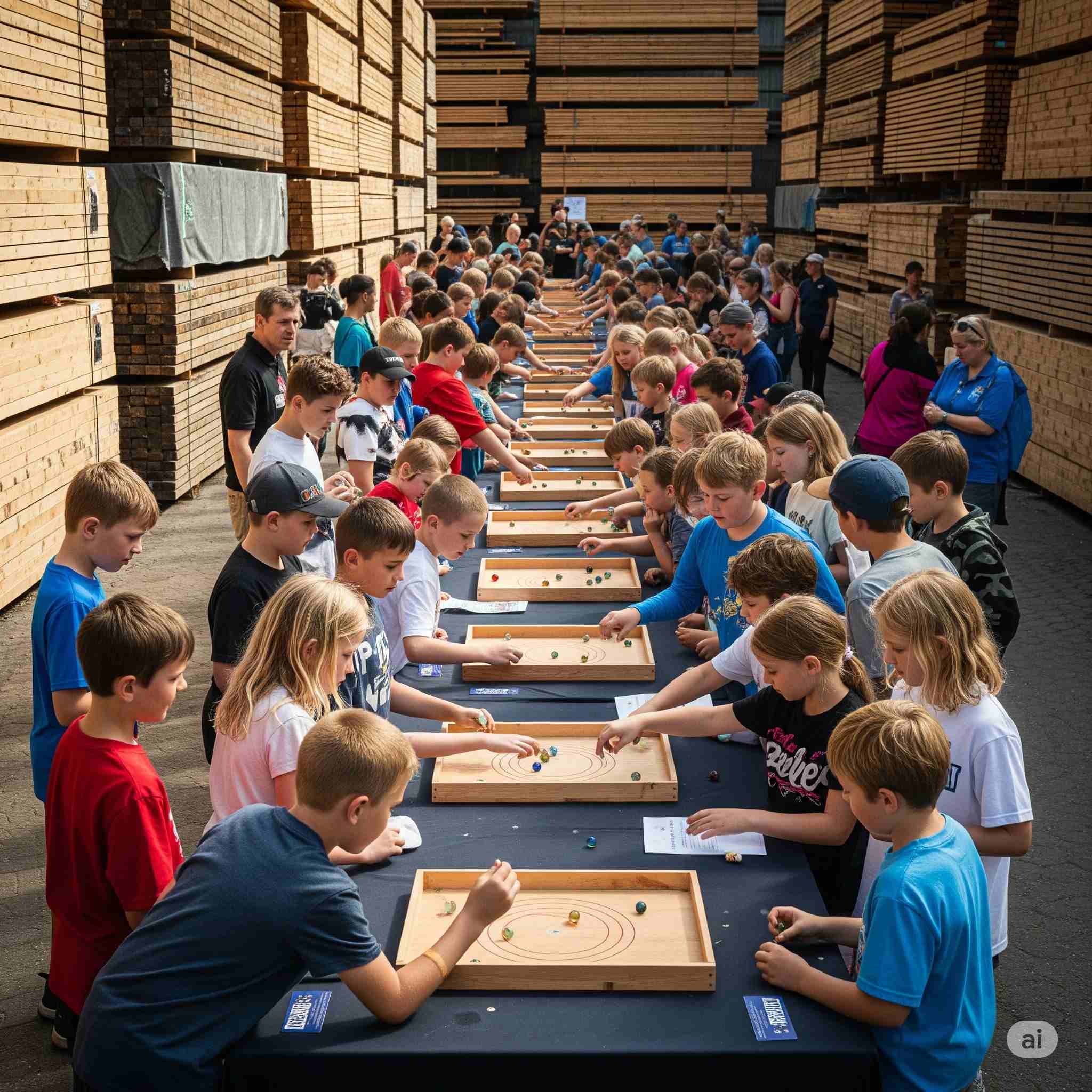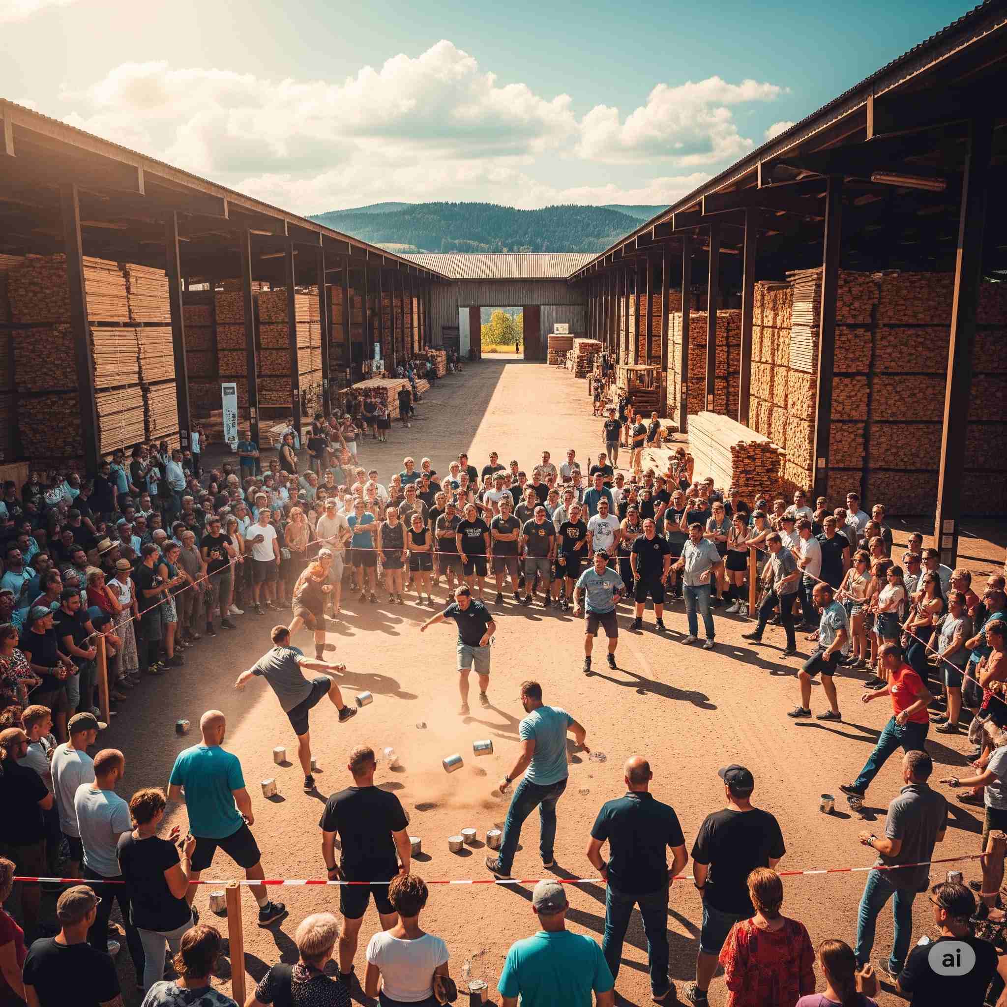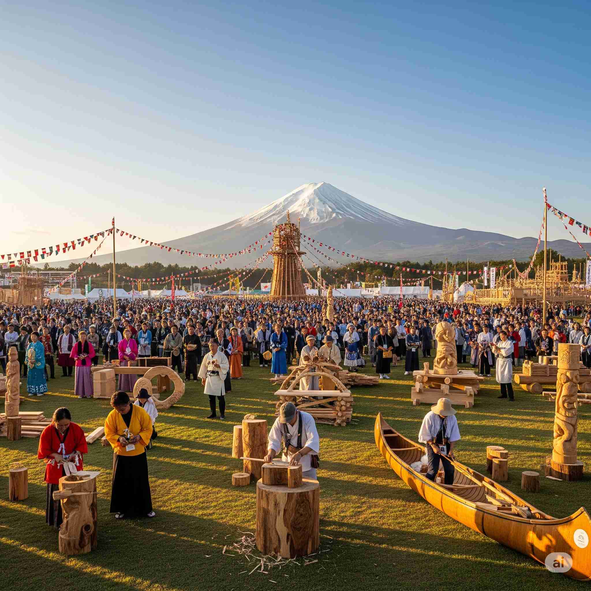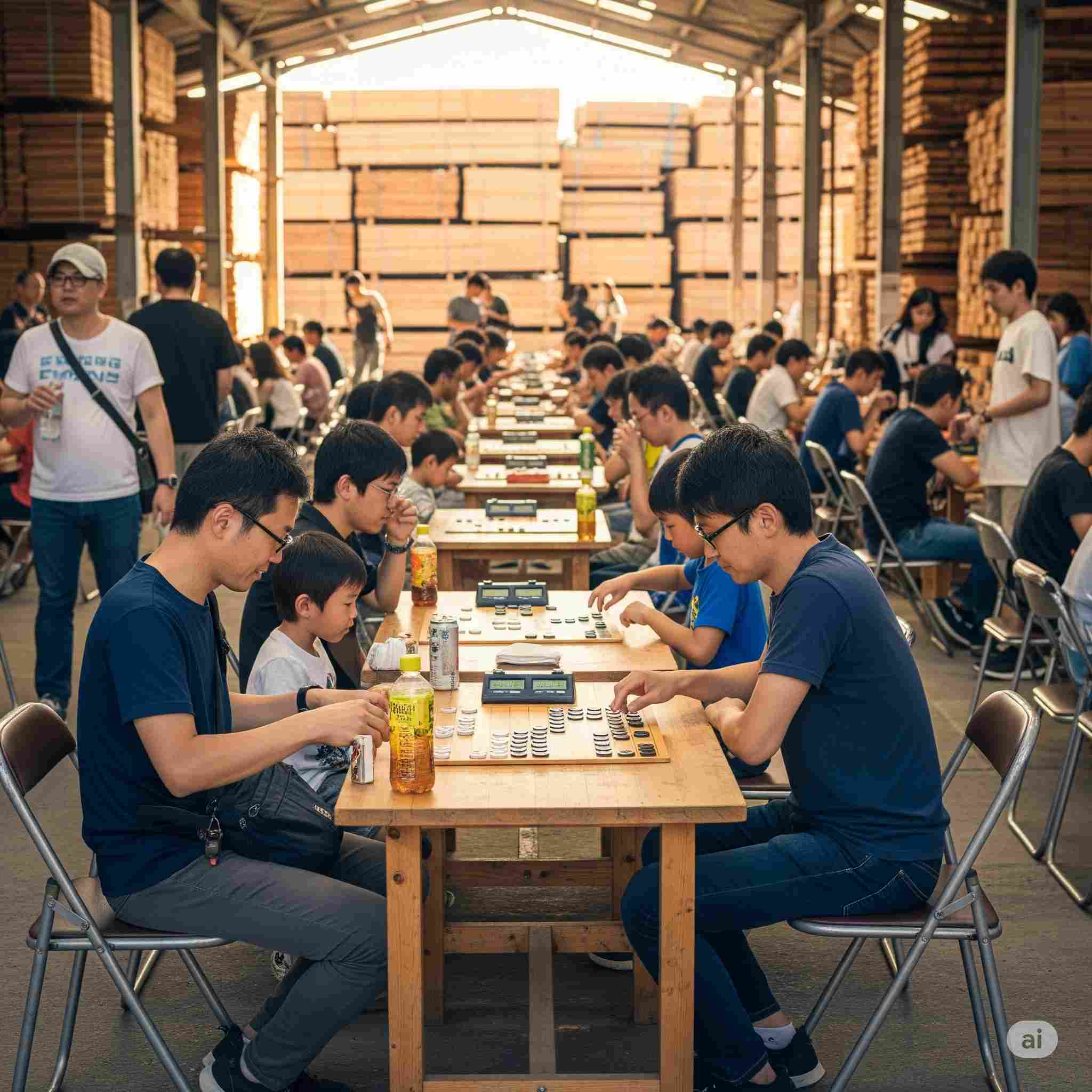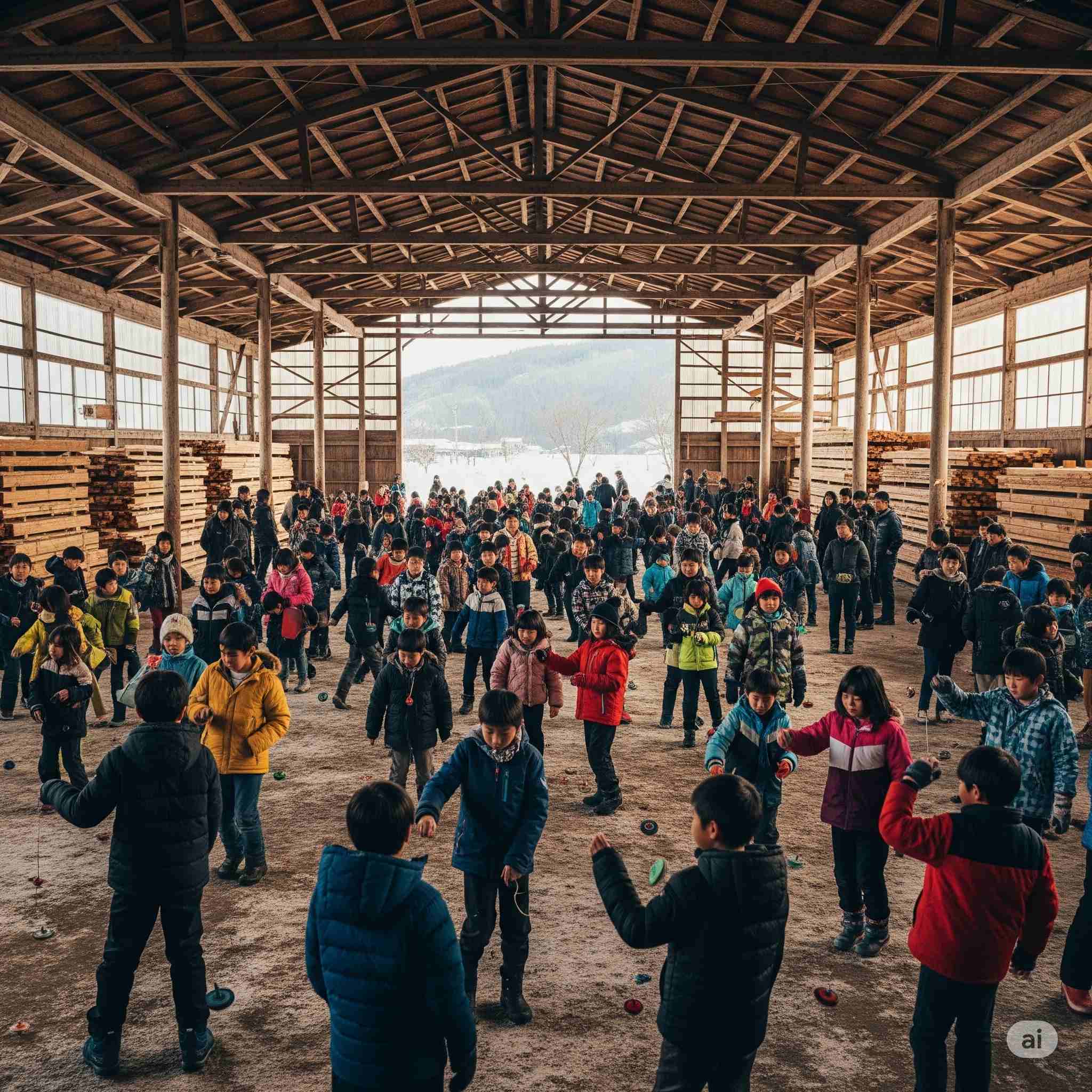 【お題】夏休み、広大な木材市場で開催されるインバウンド向けの昭和レトロな木製玩具のフェスティバル、予想図。