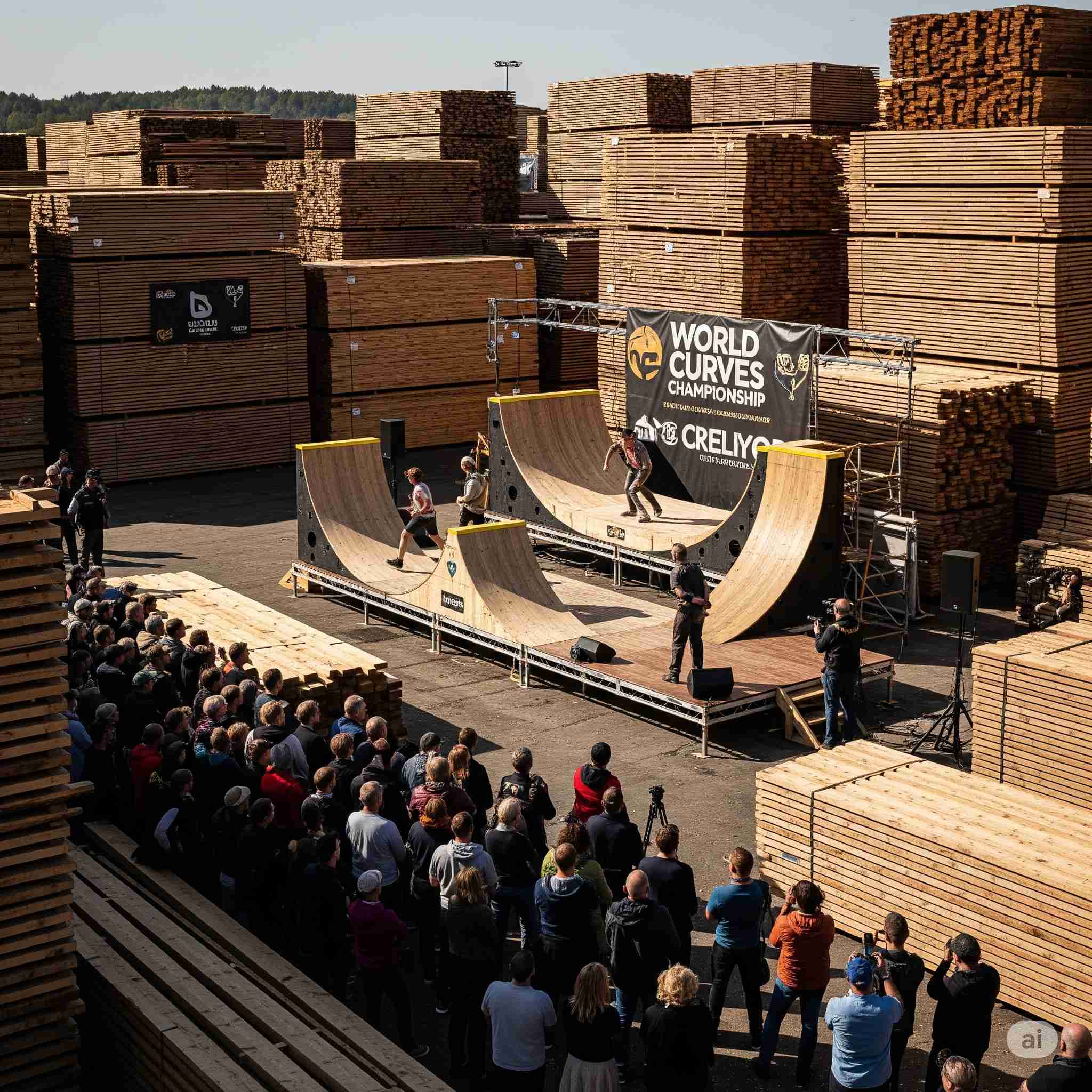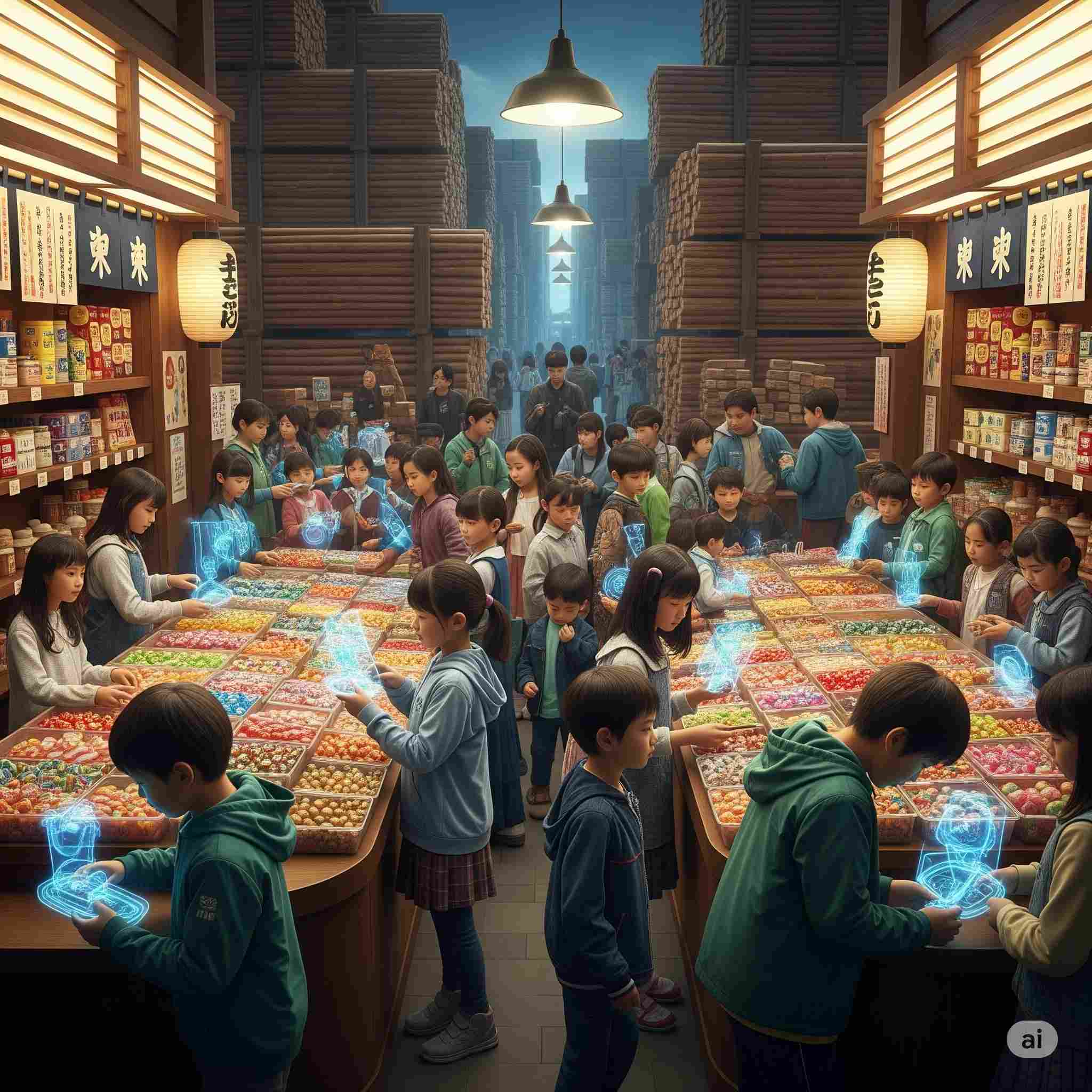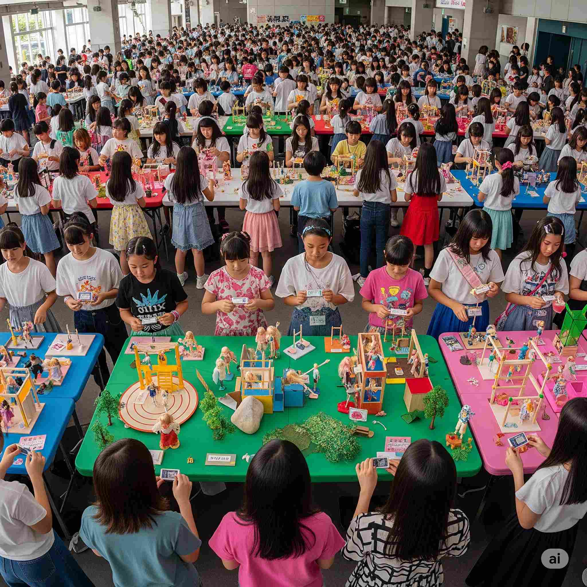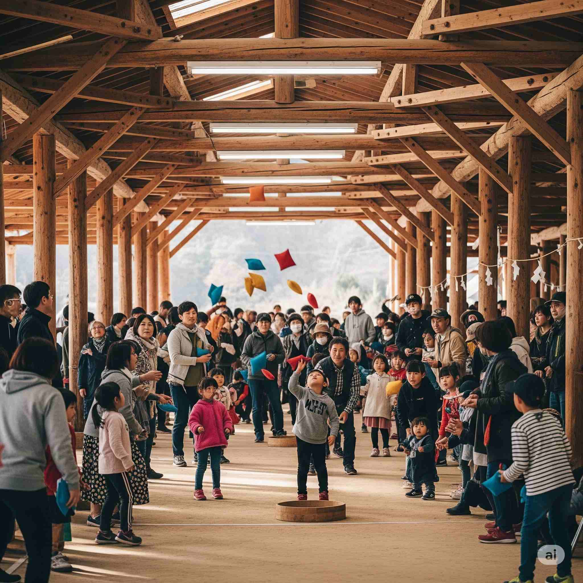 【お題】夏休み、広大な木材市場で開催されるインバウンド向けの昭和レトロな木製玩具のフェスティバル、予想図。