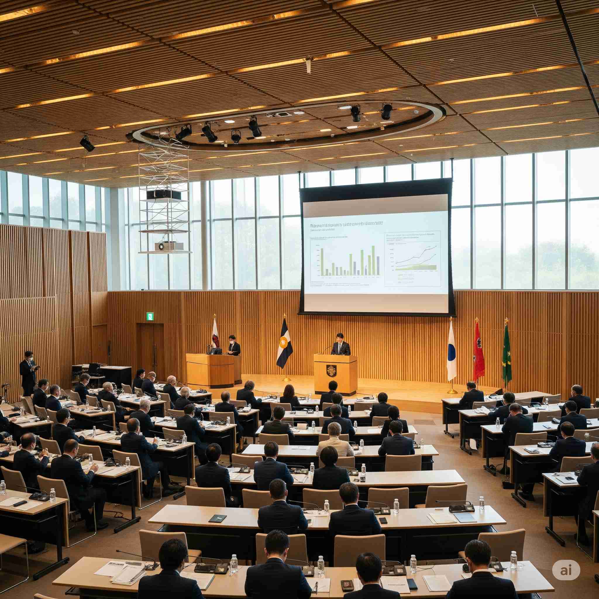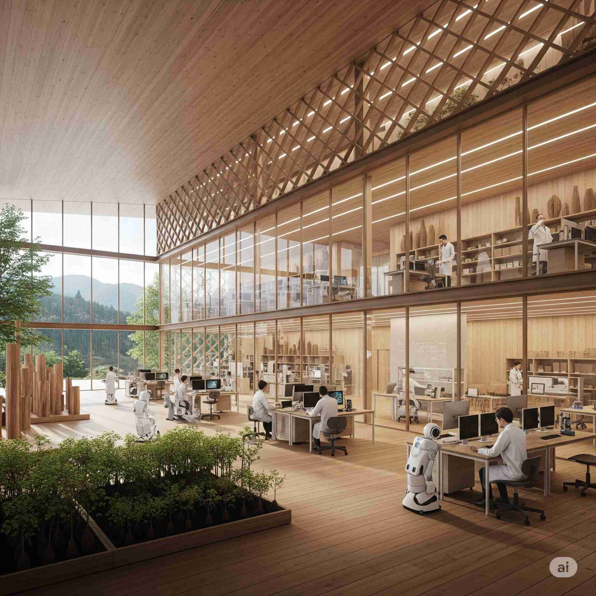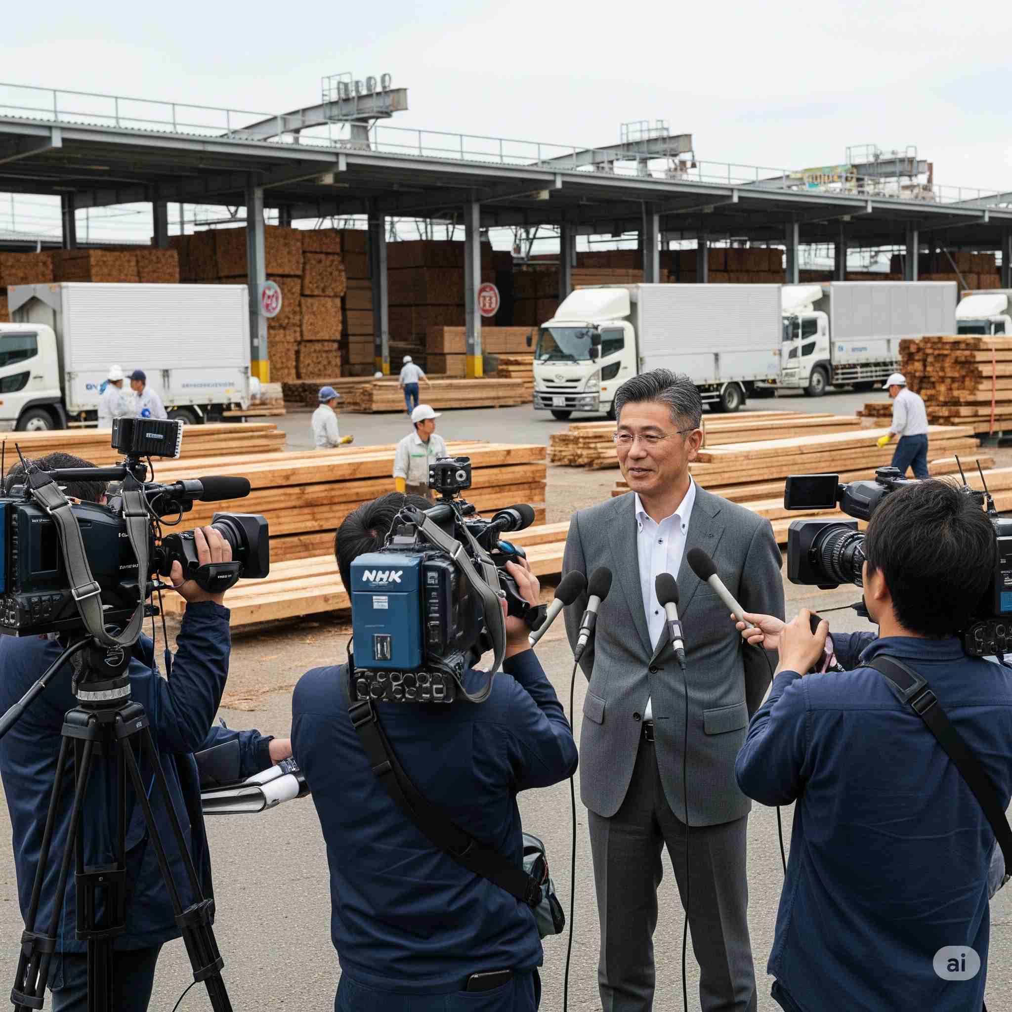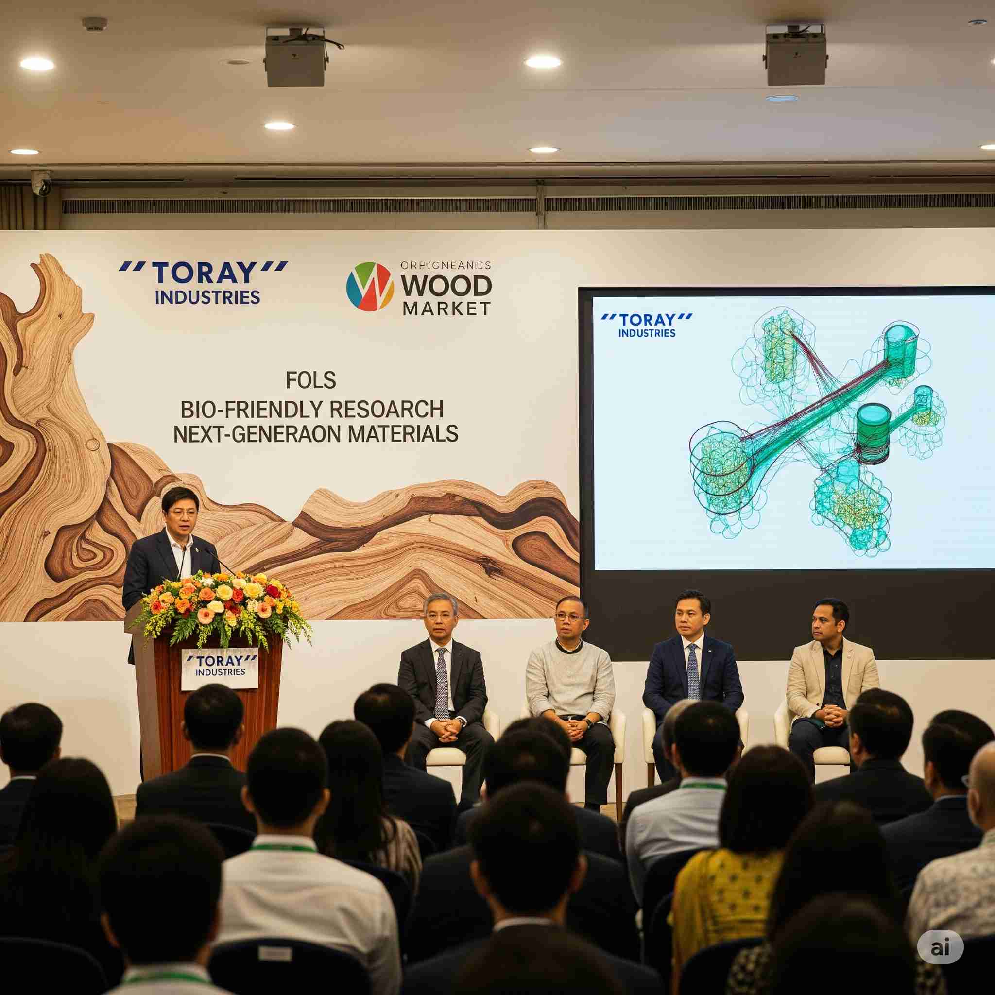【お題】大手素材企業と木材市場がコラボ、次世代のマテリアルを共同研究、記者会見の様子、予想図。