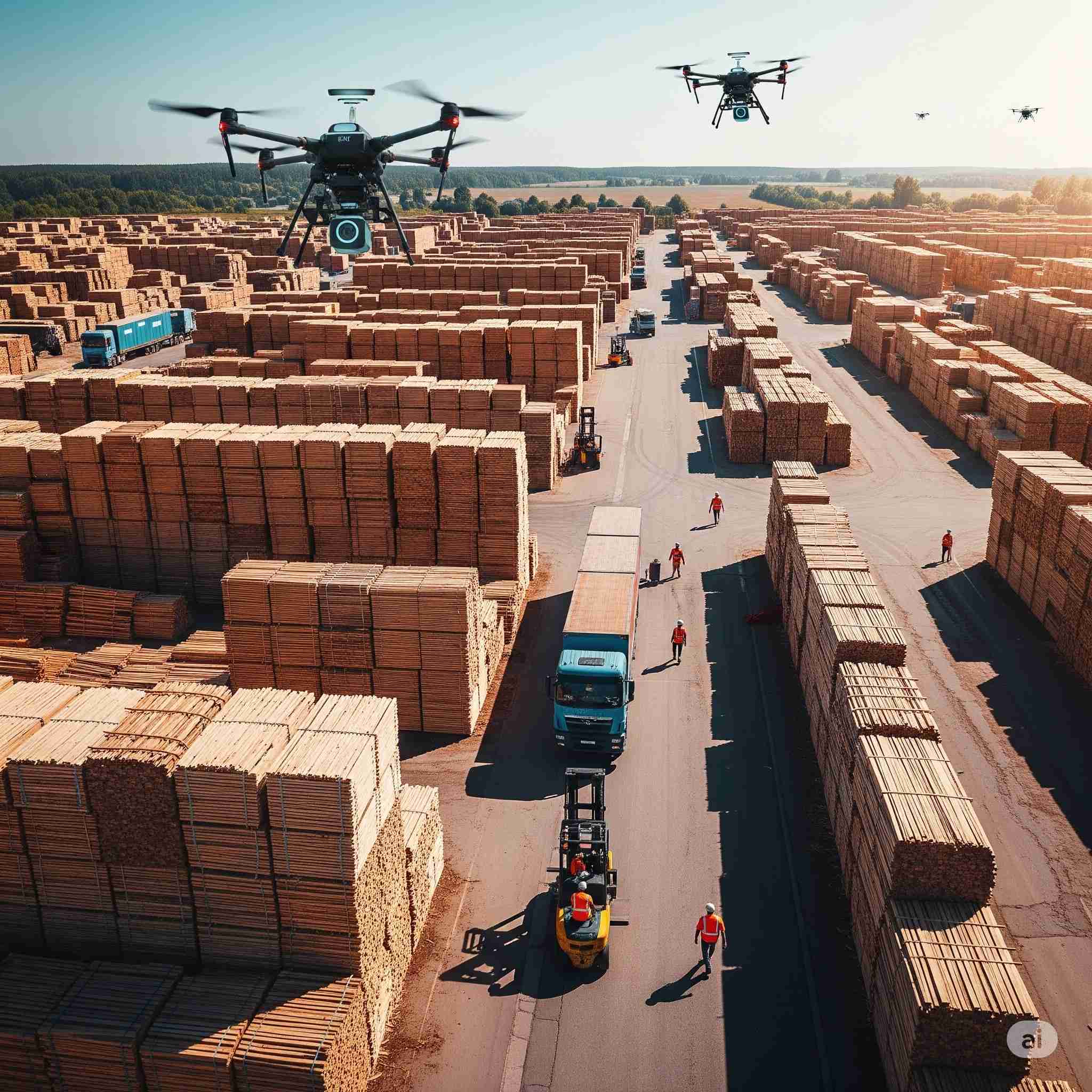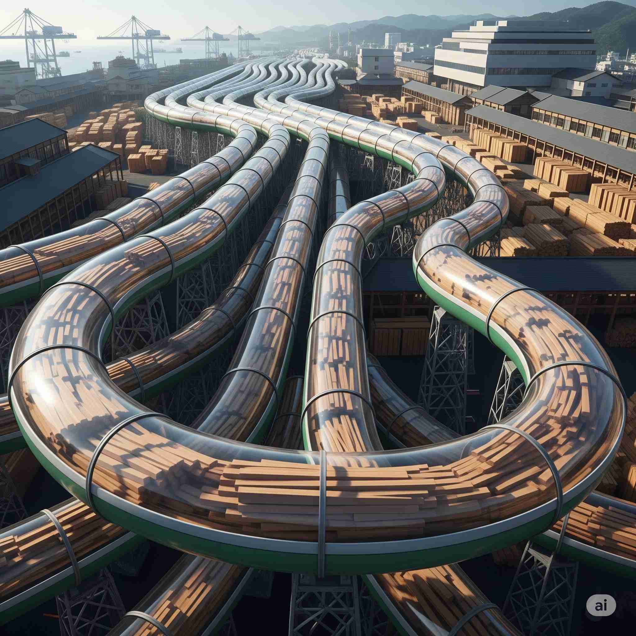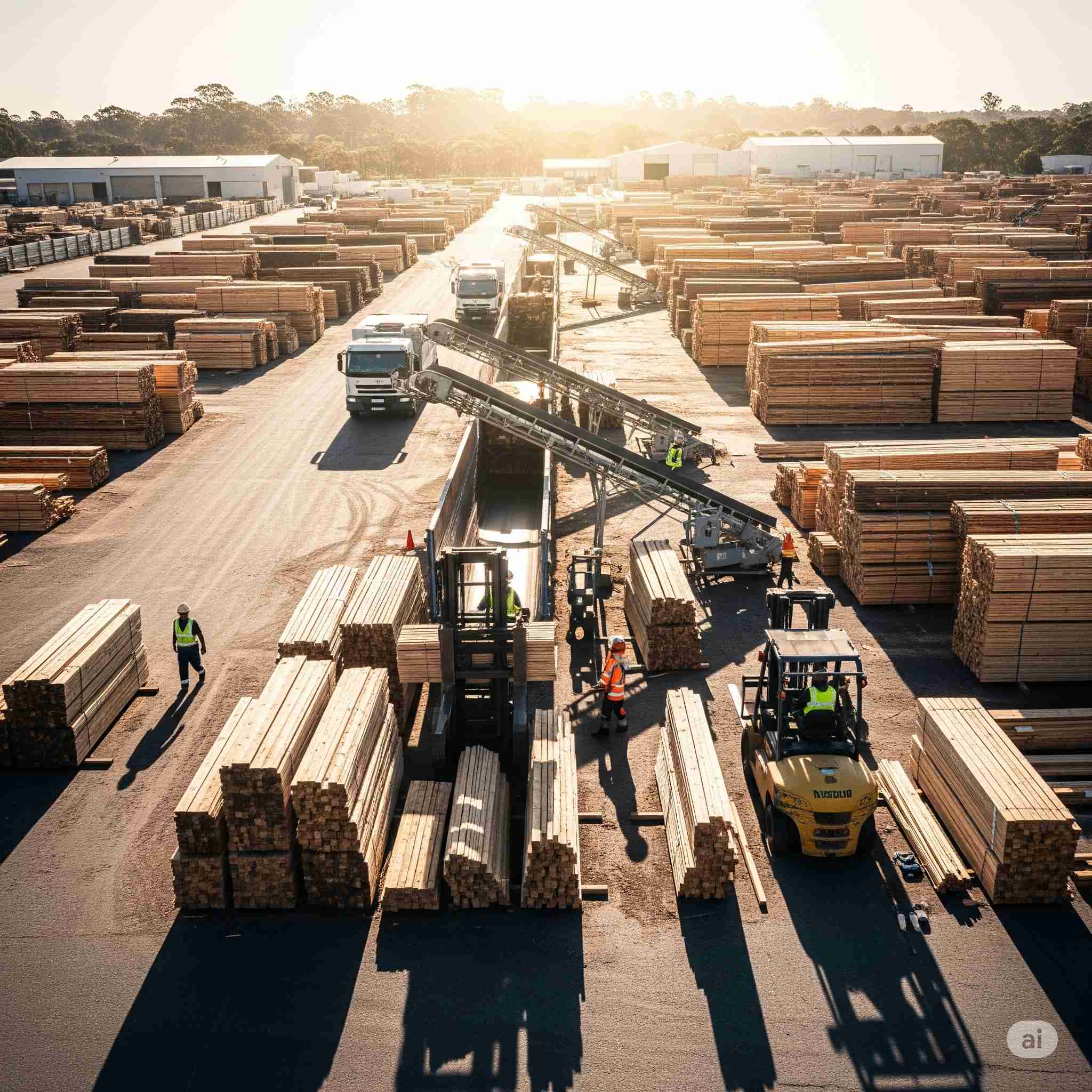 【お題】木材市場にてフォークリフトを使わずに輸送トラックから直結でベルトコンベアで材木・木材を並べる様子