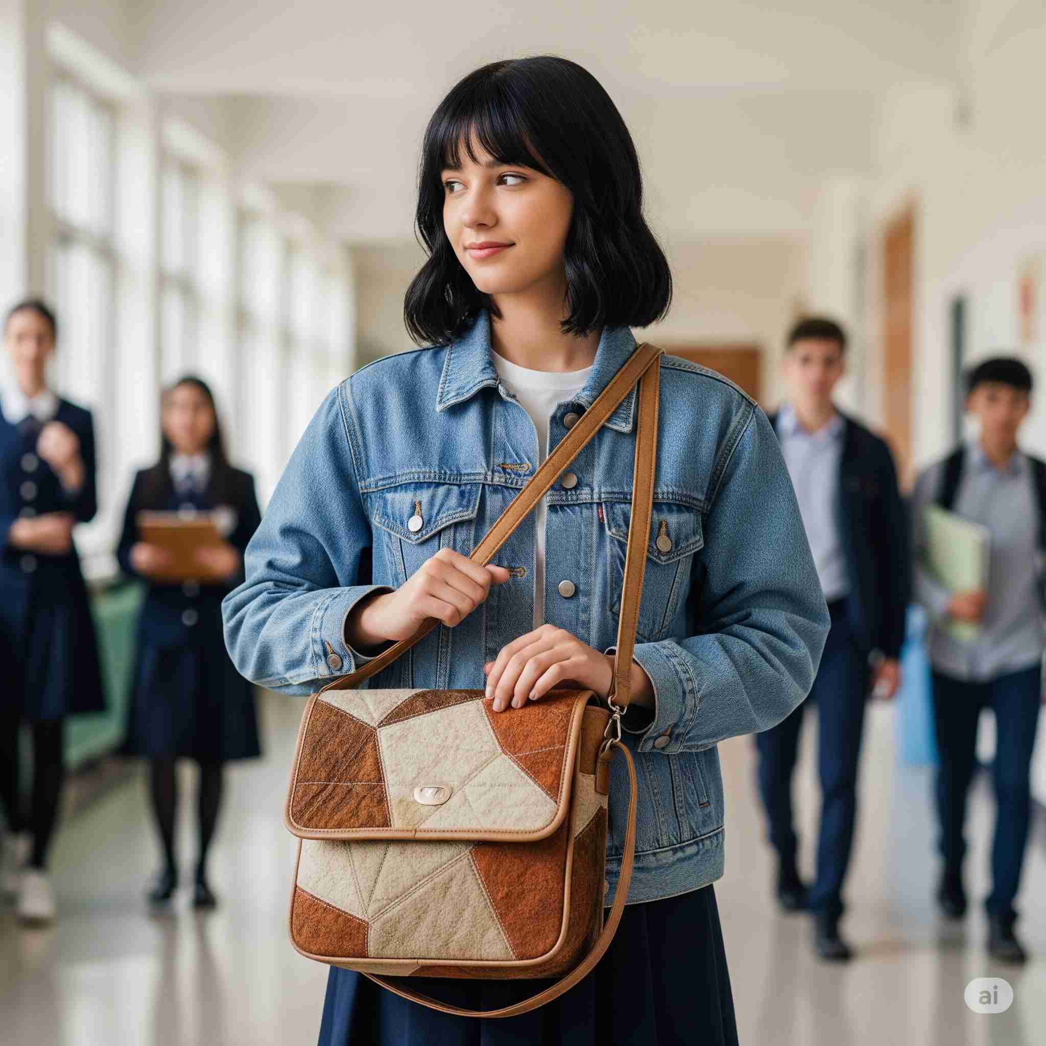 【お題】リグニン素材で作られたキルティングバッグを持つ女性