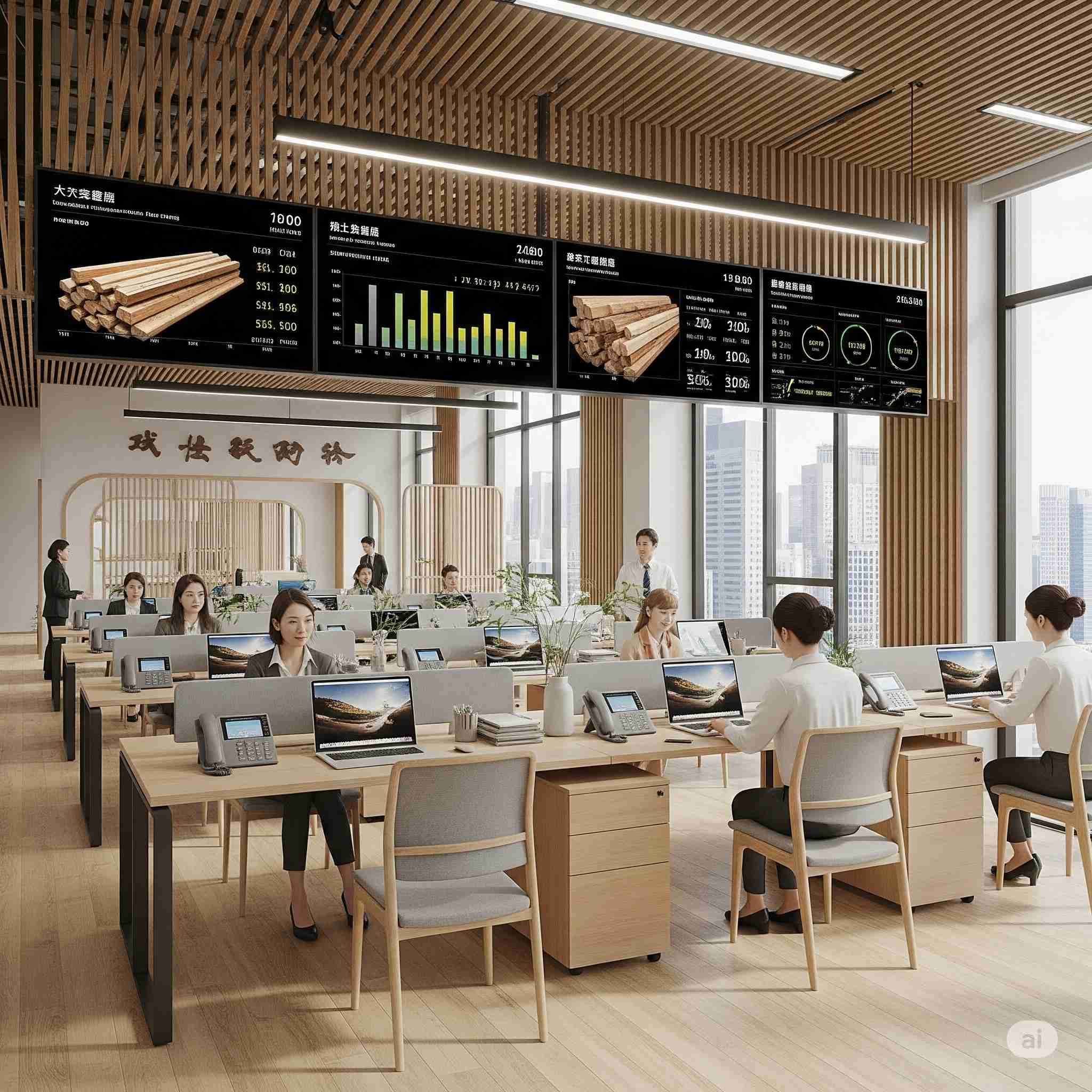 【お題】動画生成AIによる美人女性による木材市場の競りの様子、それをチェックする女性スタッフ