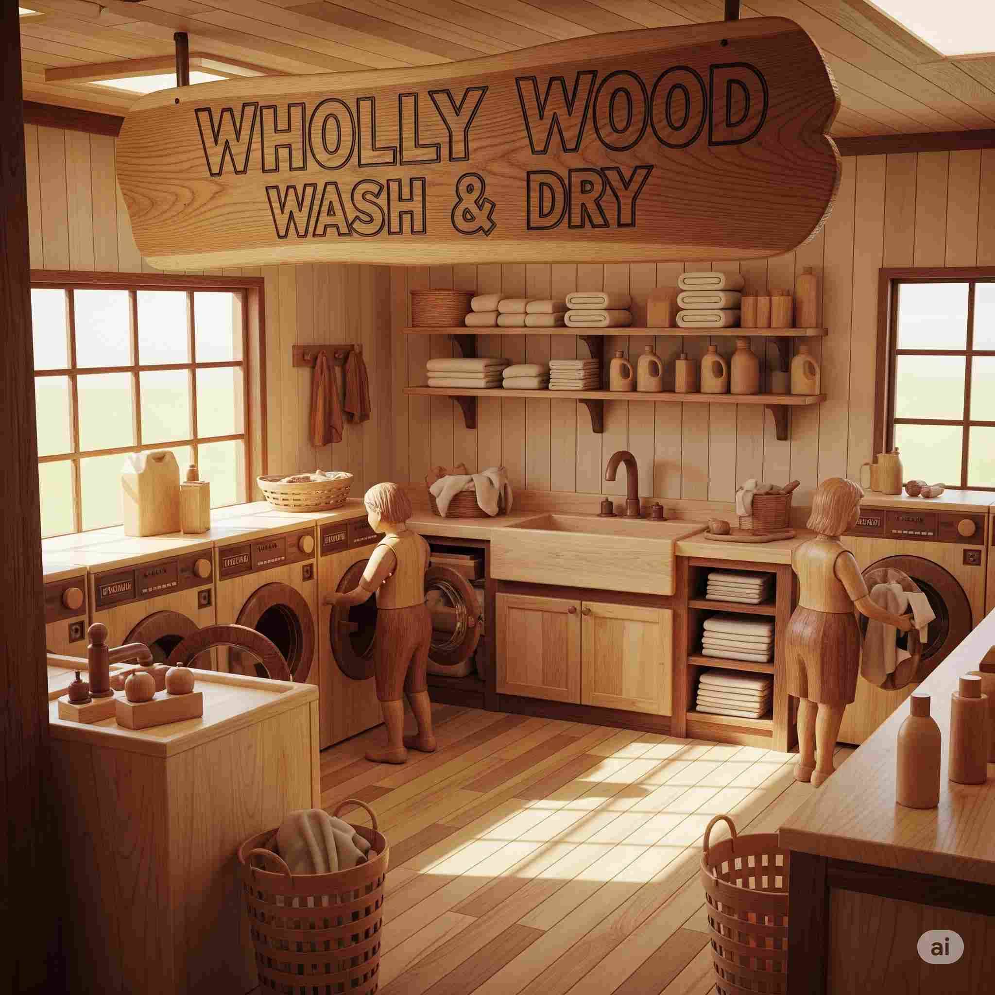 【お題】全て木材で作られたコインランドリー店の様子