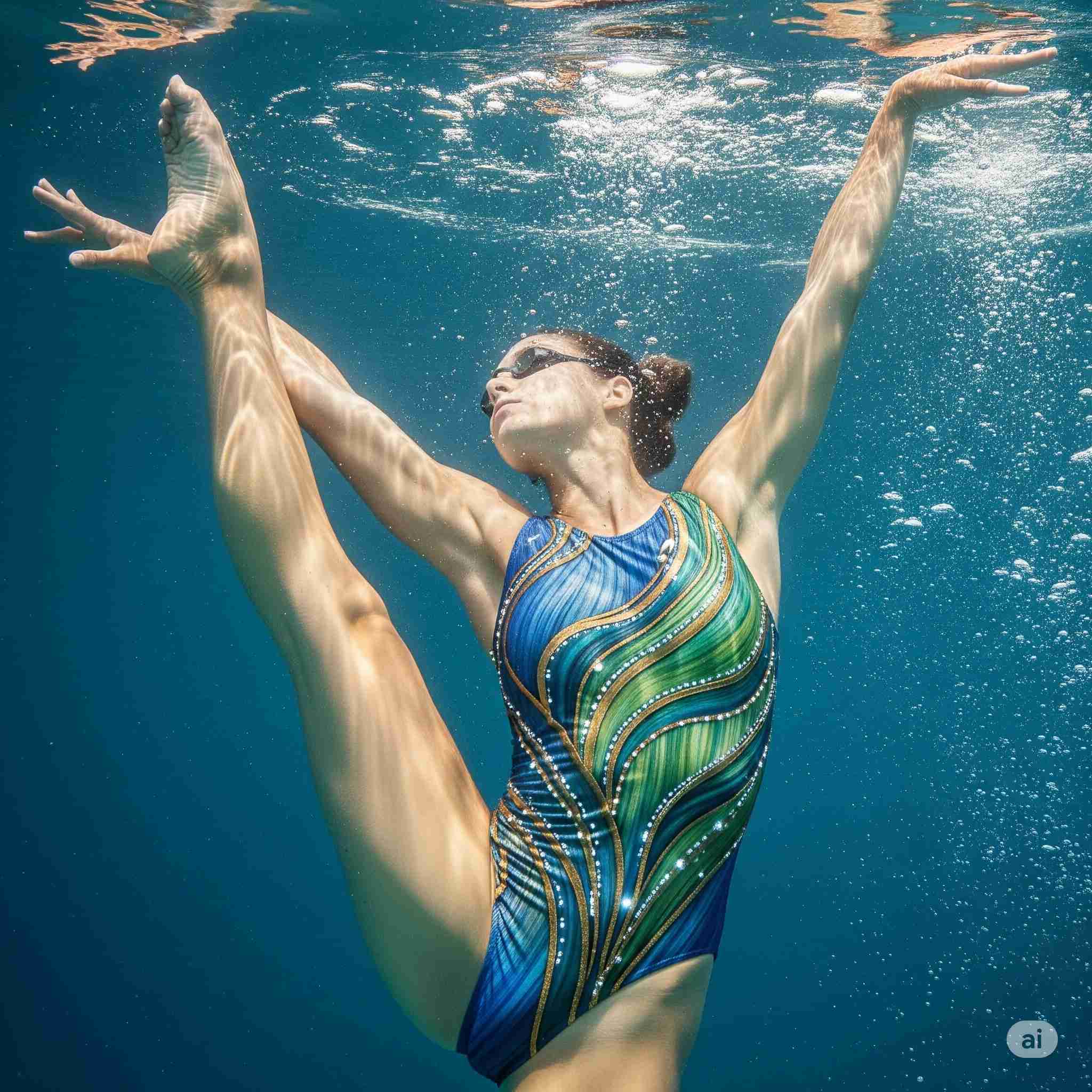 【お題】改質リグニン素材で作られたアーティスティックスイミング用水着で演技する美女