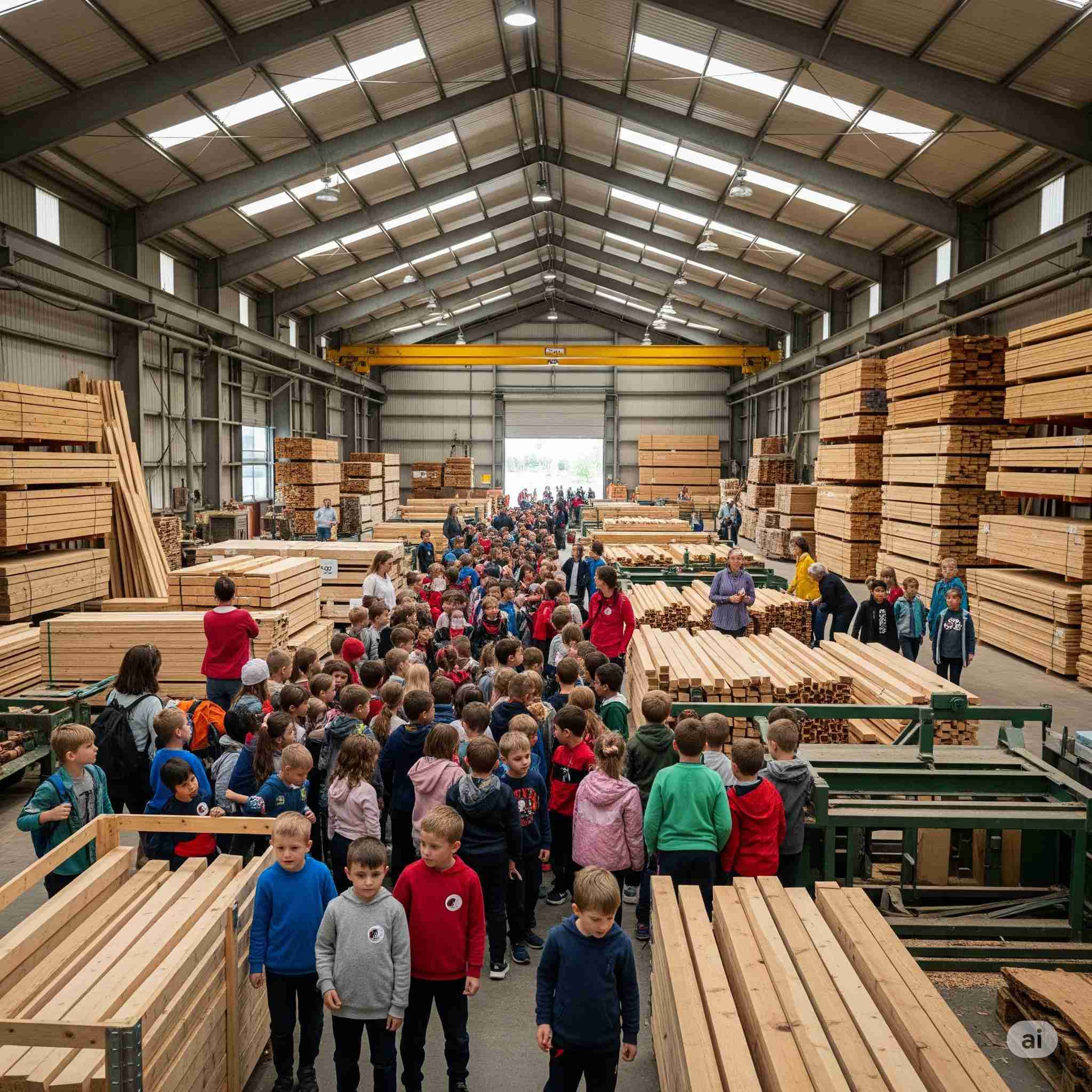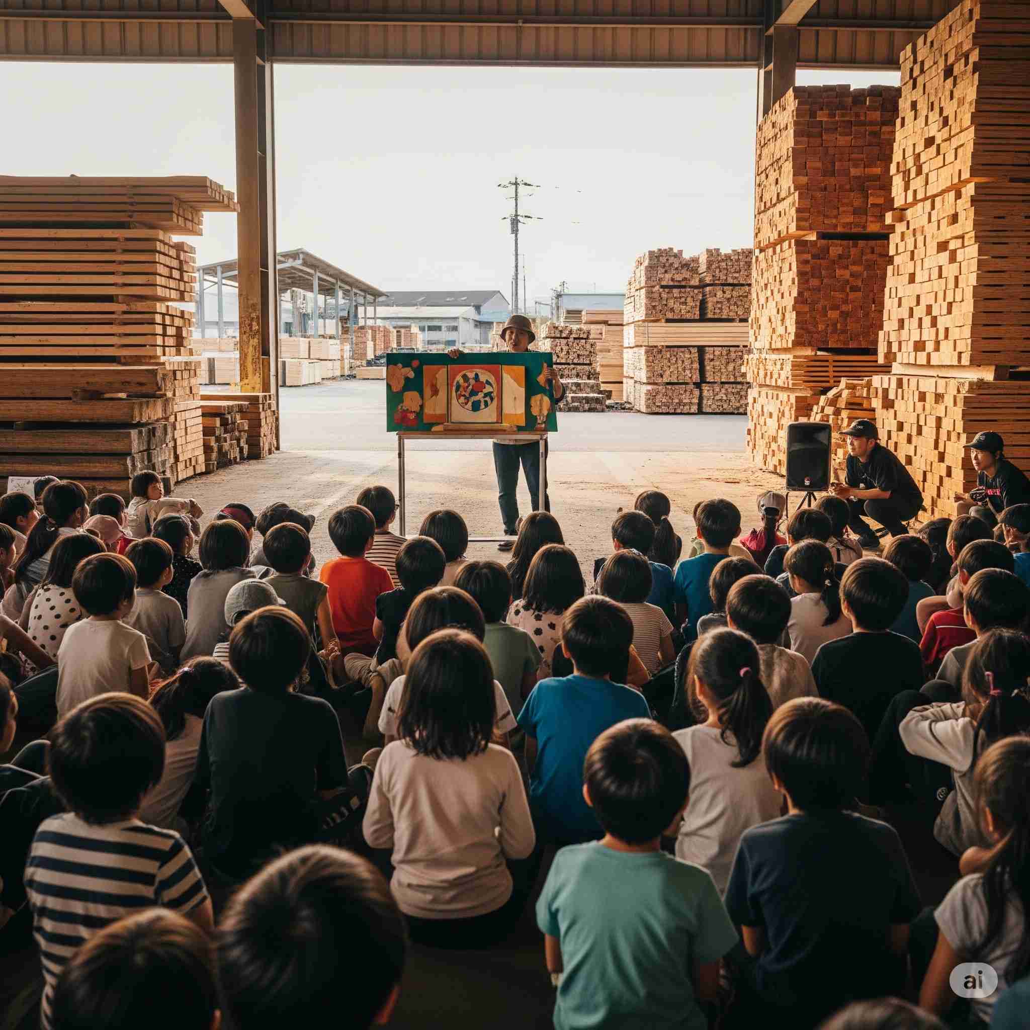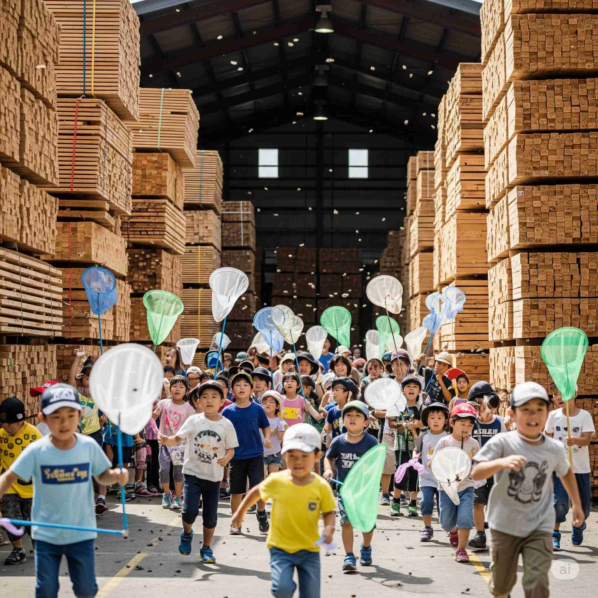 【お題】遠足で木材市場に社会見学に来た100名の小学生