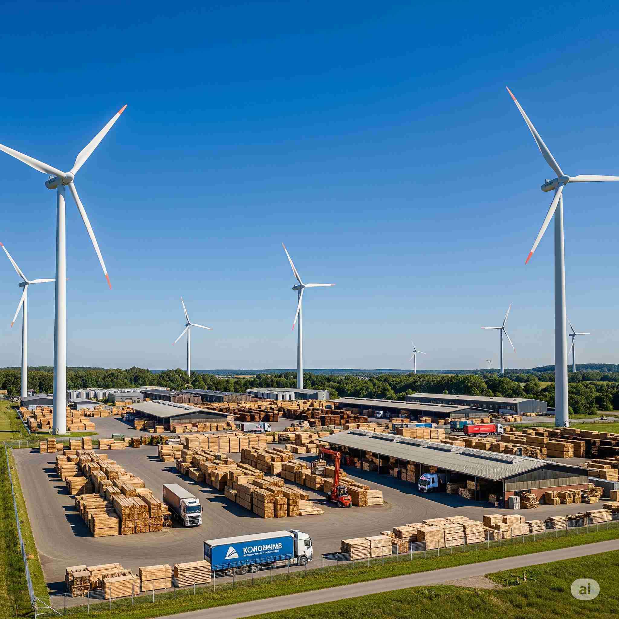 【お題】木材市場の周囲に並ぶ風力発電装置