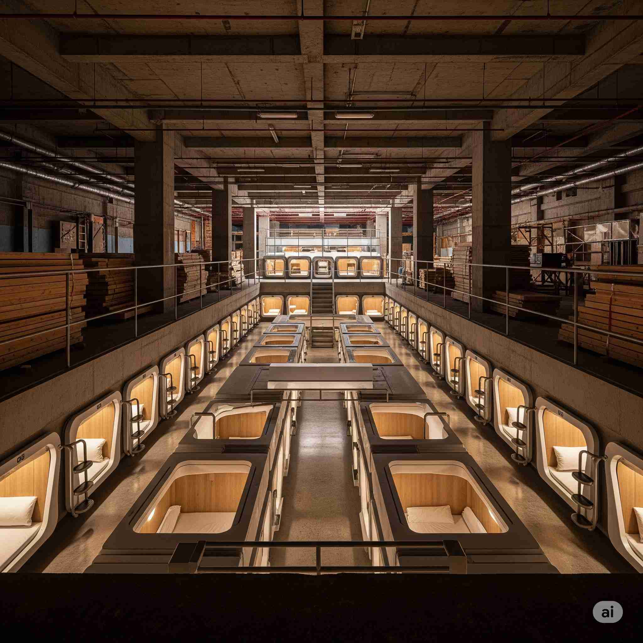 【お題】木材市場の地下に作られたカプセルホテル、予想図。