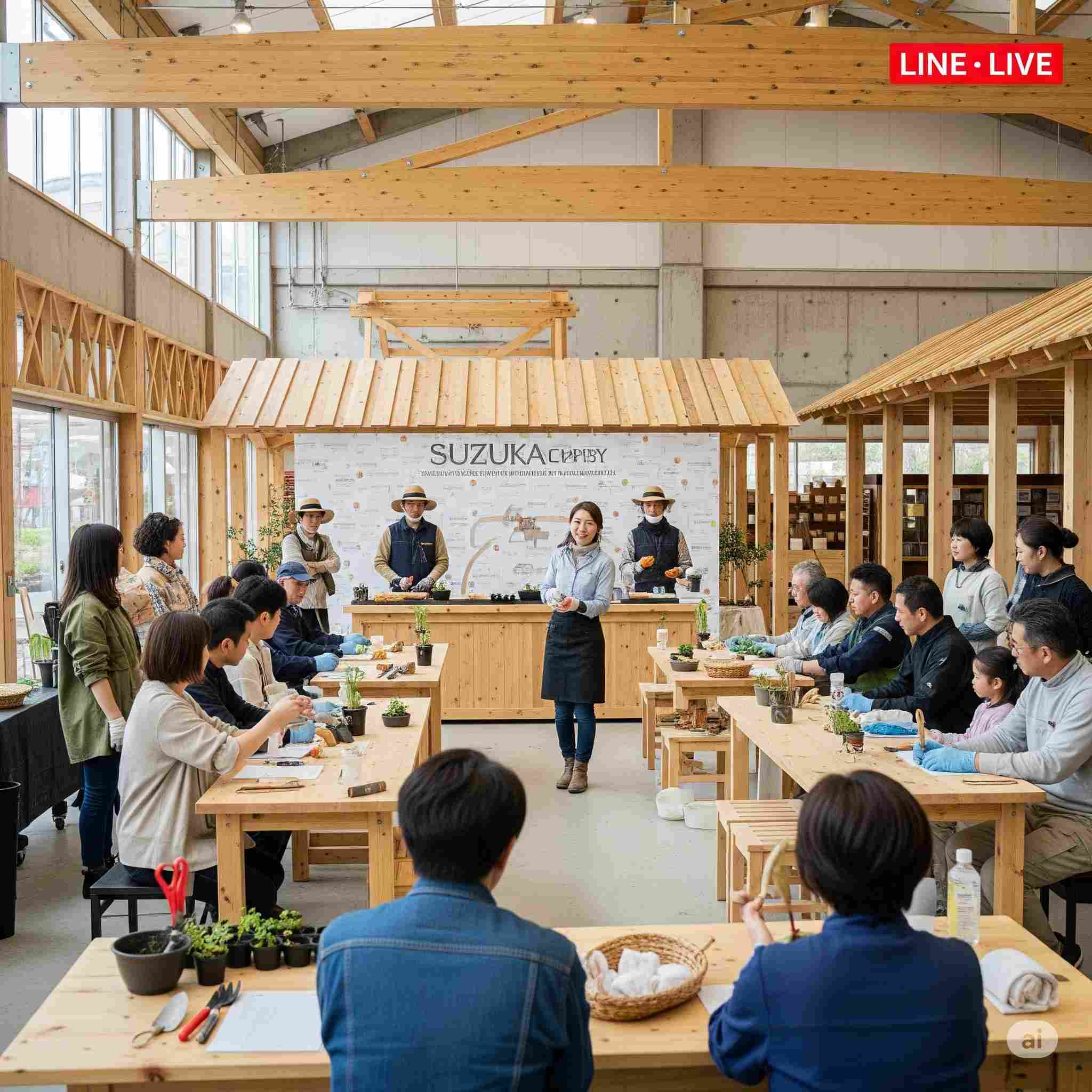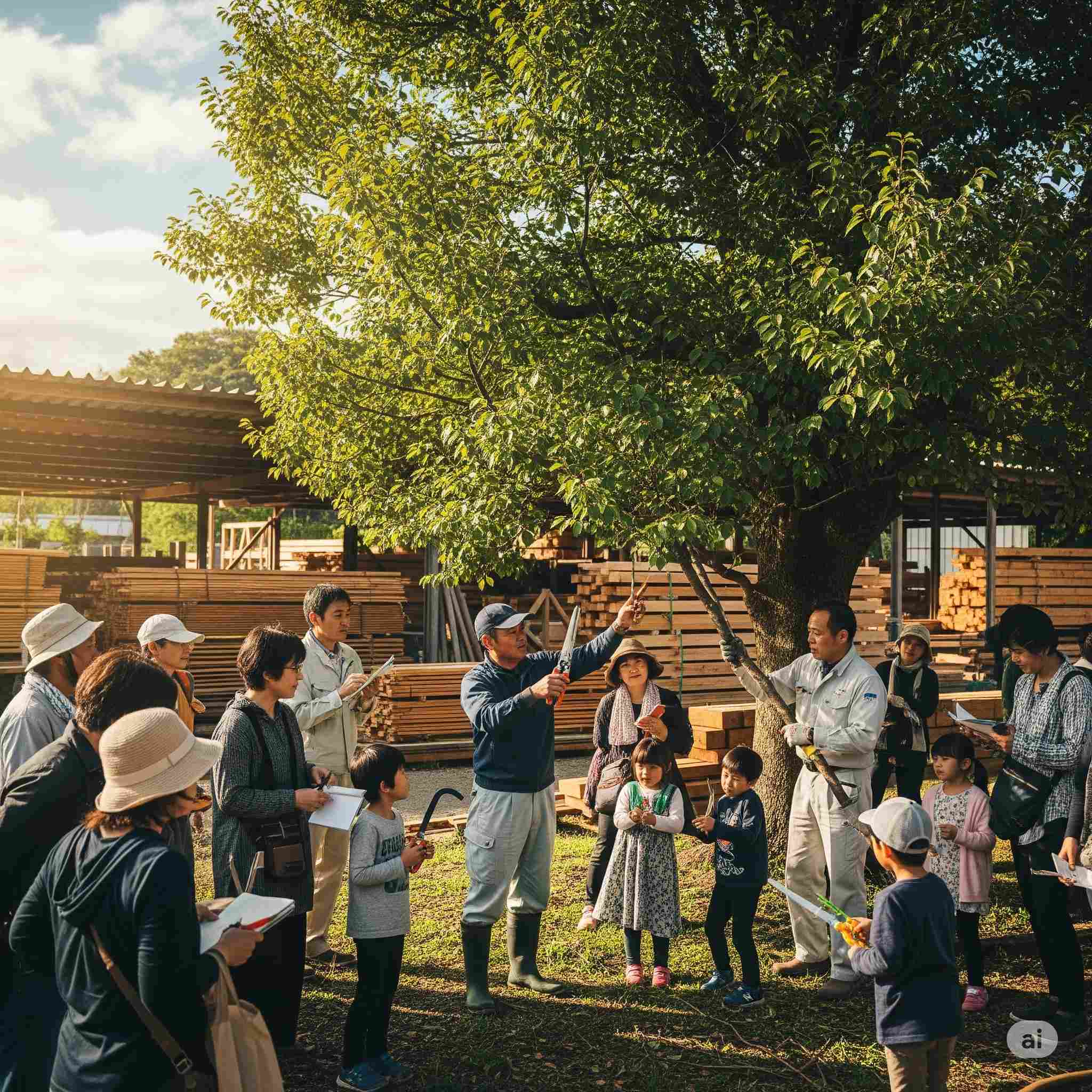 【お題】鈴鹿の木材市場にて、毎月月末に開かれている地域住民とのふれ合い「庭木の剪定」教室。予想図