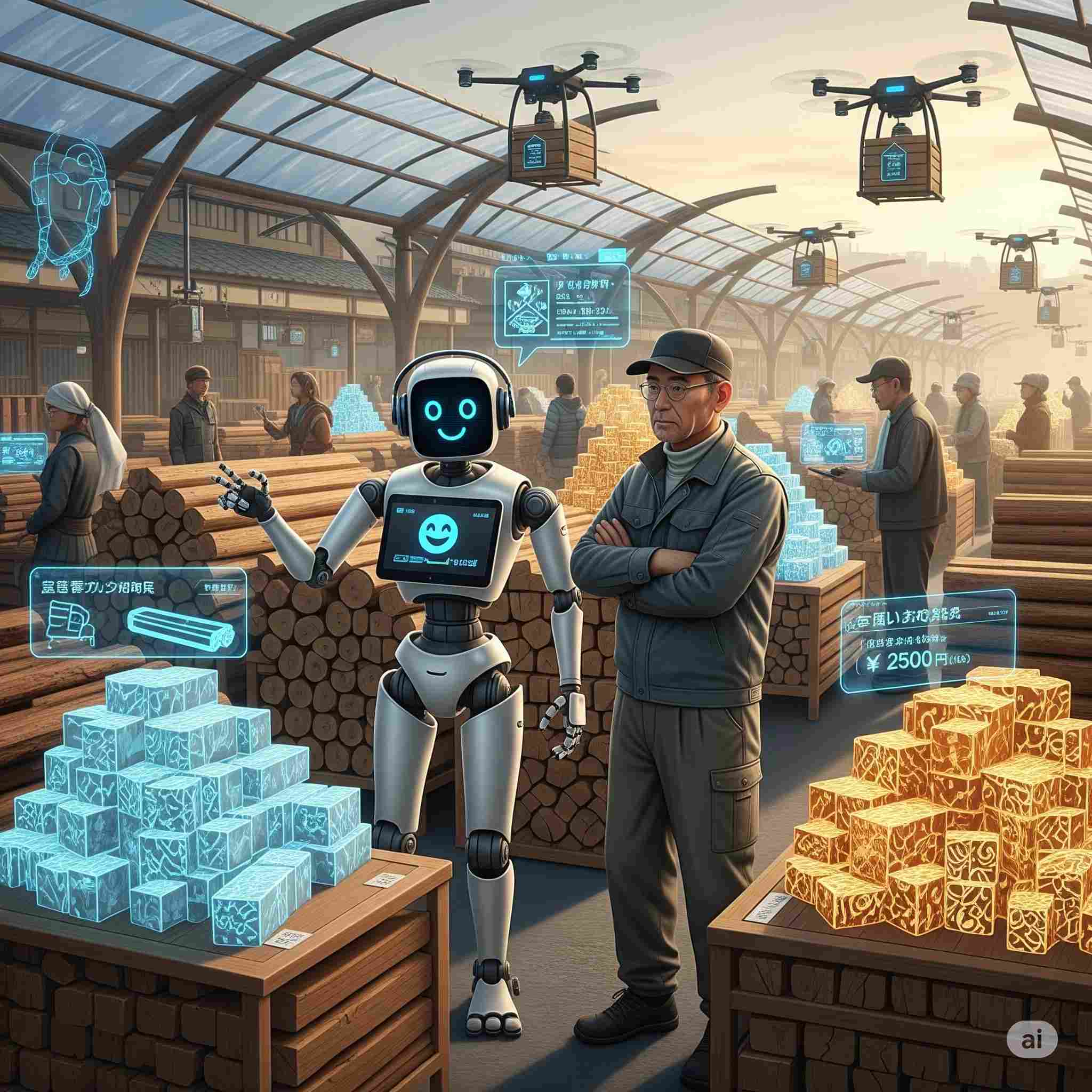 【お題】西暦2101年、鈴鹿の木材市場にて、口下手な営業マンのために同伴する営業ロボット